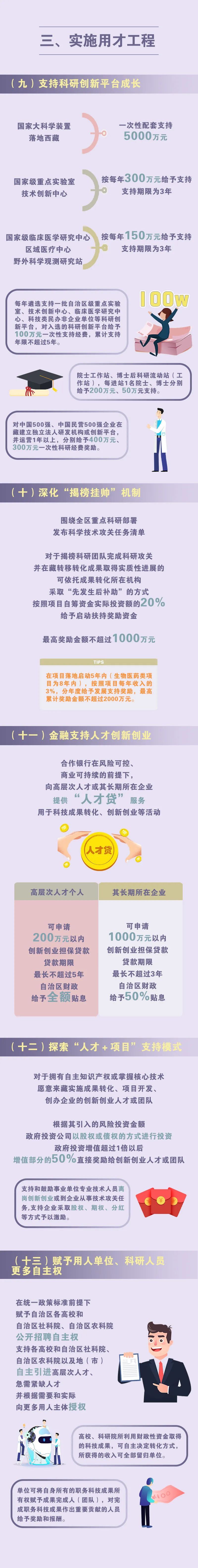 支持科研創(chuàng)新平臺(tái)成長,對(duì)重點(diǎn)實(shí)驗(yàn)室、技術(shù)創(chuàng)新中心以及院士工作站、博士后科研流動(dòng)站(工作站)等給予經(jīng)費(fèi)支持。深化“揭榜掛帥”機(jī)制,對(duì)完成科研攻關(guān)并在藏轉(zhuǎn)化成果取得實(shí)質(zhì)性進(jìn)展的,給予啟動(dòng)扶持獎(jiǎng)勵(lì)資金、發(fā)展支持獎(jiǎng)勵(lì)資金。向高層次人才或其長期所在企業(yè)提供“人才貸”服務(wù),自治區(qū)財(cái)政予以貼息。鼓勵(lì)創(chuàng)新創(chuàng)業(yè)人才或團(tuán)隊(duì)來藏實(shí)施成果轉(zhuǎn)化、項(xiàng)目開發(fā)、創(chuàng)辦企業(yè),政府投資公司參與創(chuàng)新創(chuàng)業(yè)項(xiàng)目,政府投資增值的部分收益可直接用于獎(jiǎng)勵(lì)。在統(tǒng)一政策標(biāo)準(zhǔn)、嚴(yán)格執(zhí)行規(guī)定前提下,賦予用人單位、科研人員更多自主權(quán)。