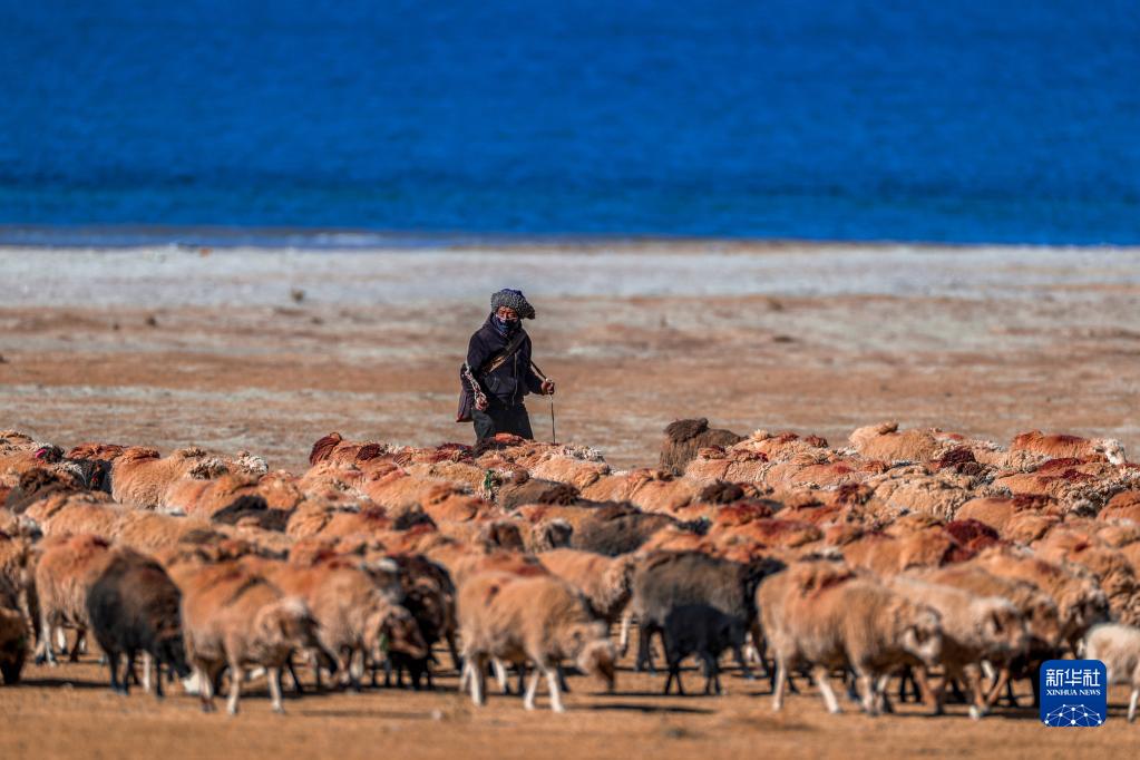 牧民在羊卓雍錯湖邊放羊(12月11日攝)。新華社記者 姜帆 攝