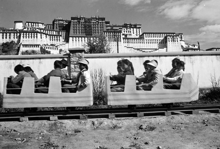 1987年10月1日,在拉薩勞動(dòng)人民文化宮內(nèi)新建成一座大型游樂(lè)場(chǎng)里,小朋友們?cè)诔俗妱?dòng)小火車。