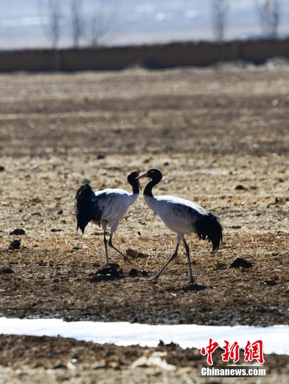 每年的10月底,成群的黑頸鶴飛到西藏拉薩市林周縣越冬,在拉薩市林周縣周邊的湖泊濕地度過5個月的“閑云野鶴”生活,次年三四月份再飛向藏北草原繁殖。黑頸鶴是世界上唯一一種高原鶴類。具有足長、喙長、頸長的典型涉禽類特征,適合在沼澤地里行走。黑頸鶴的頸、尾為黑色,體羽為灰白色。黑頸鶴是國家一級保護(hù)動物。目前,每年到林周縣越冬的黑頸鶴已達(dá)2000只左右。圖為黑頸鶴在林周境內(nèi)的農(nóng)田里覓食、嬉戲。 貢嘎來松 攝