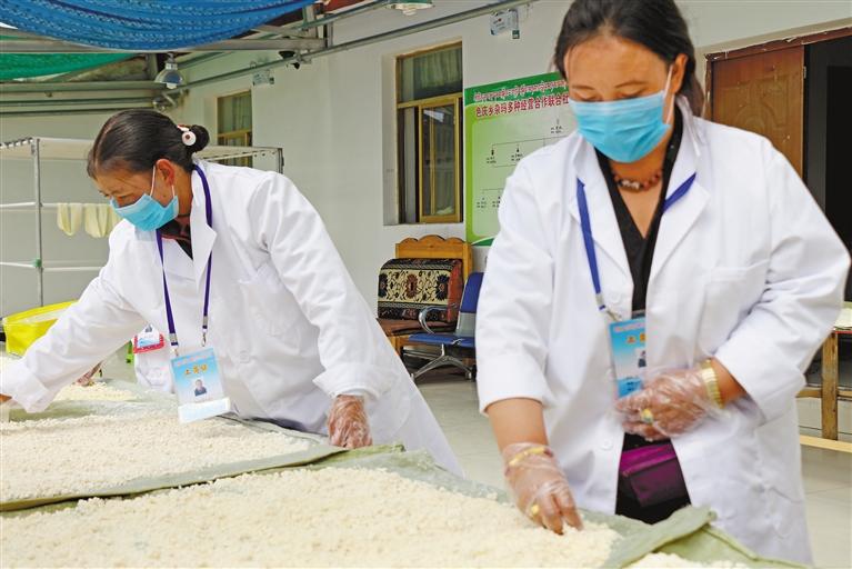圖為聶榮縣色慶鄉(xiāng)雜瑪多種經(jīng)營合作社工作人員對奶渣進(jìn)行干燥處理。 記者 萬靖 謝偉 攝