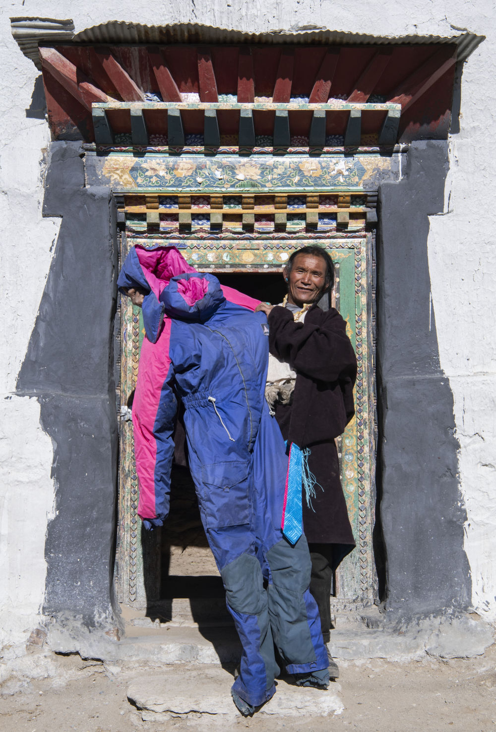 格桑在展示自己登頂時(shí)穿過(guò)的連體羽絨服(2020年1月22日攝)。