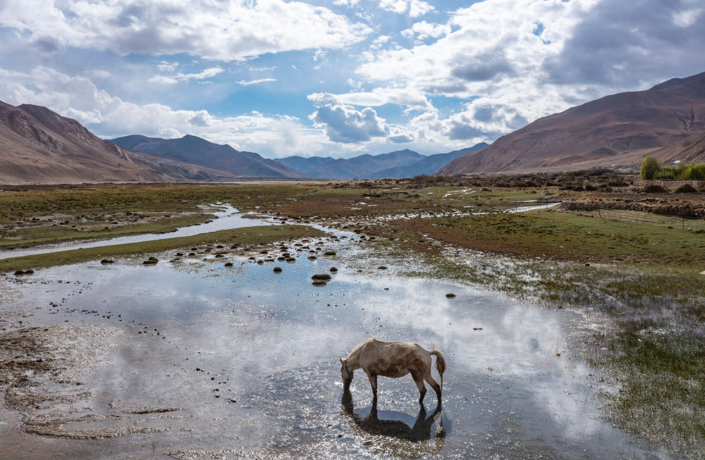 天氣轉(zhuǎn)暖,珠峰腳下顯露出一抹綠色。流經(jīng)扎西宗鄉(xiāng)的扎嘎曲河,綠樹(shù)吐出新芽,馬兒在濕地里悠閑吃草。