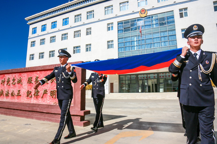 圖為拉薩鐵路公安民警高擎警旗走過“四句話、十六字”訓詞前。單義倫攝