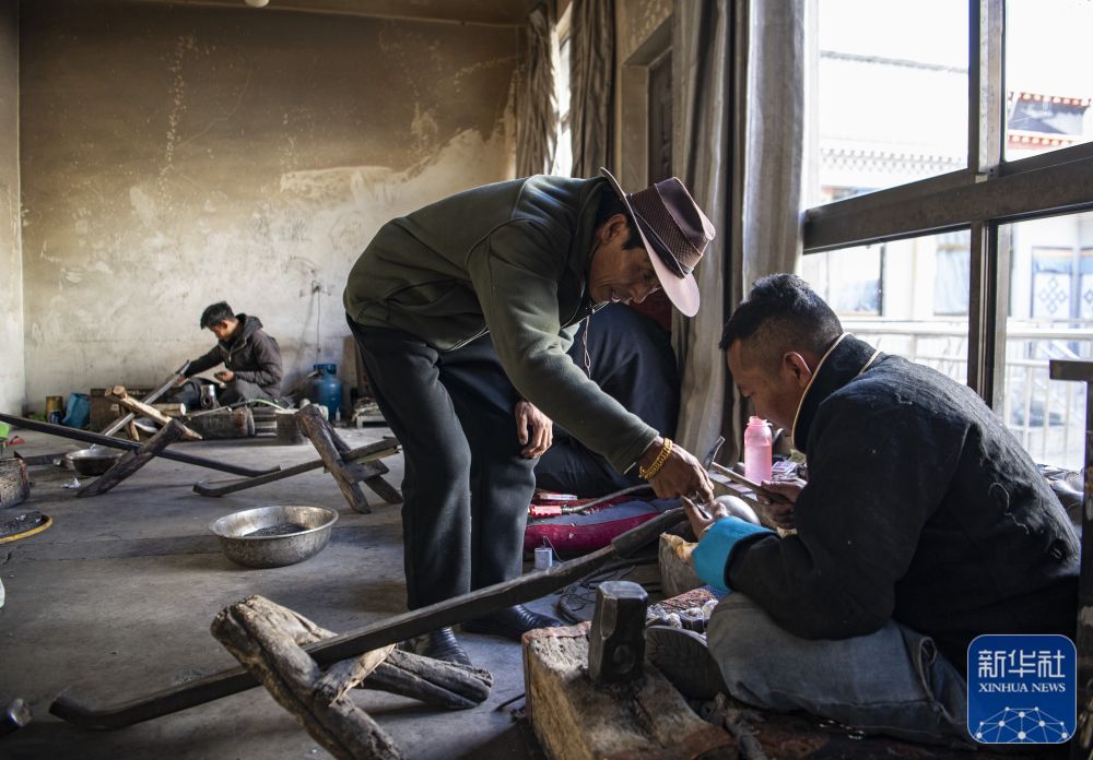 在扎西吉彩金銀銅器廠,廠長拉巴瓊達(前左)在指導(dǎo)年輕的手工藝人(3月9日攝)。