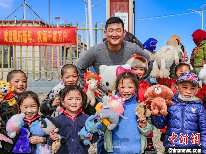圖為孩子們拿到毛絨玩具后合影留念。丁增 攝