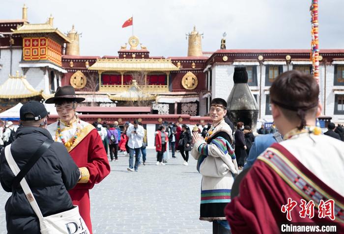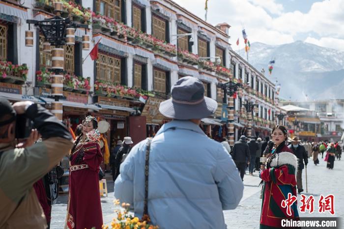 3月14日,游客穿上藏族傳統(tǒng)服飾在拉薩市八廓街拍照留念。 中新社記者 貢嘎來(lái)松 攝