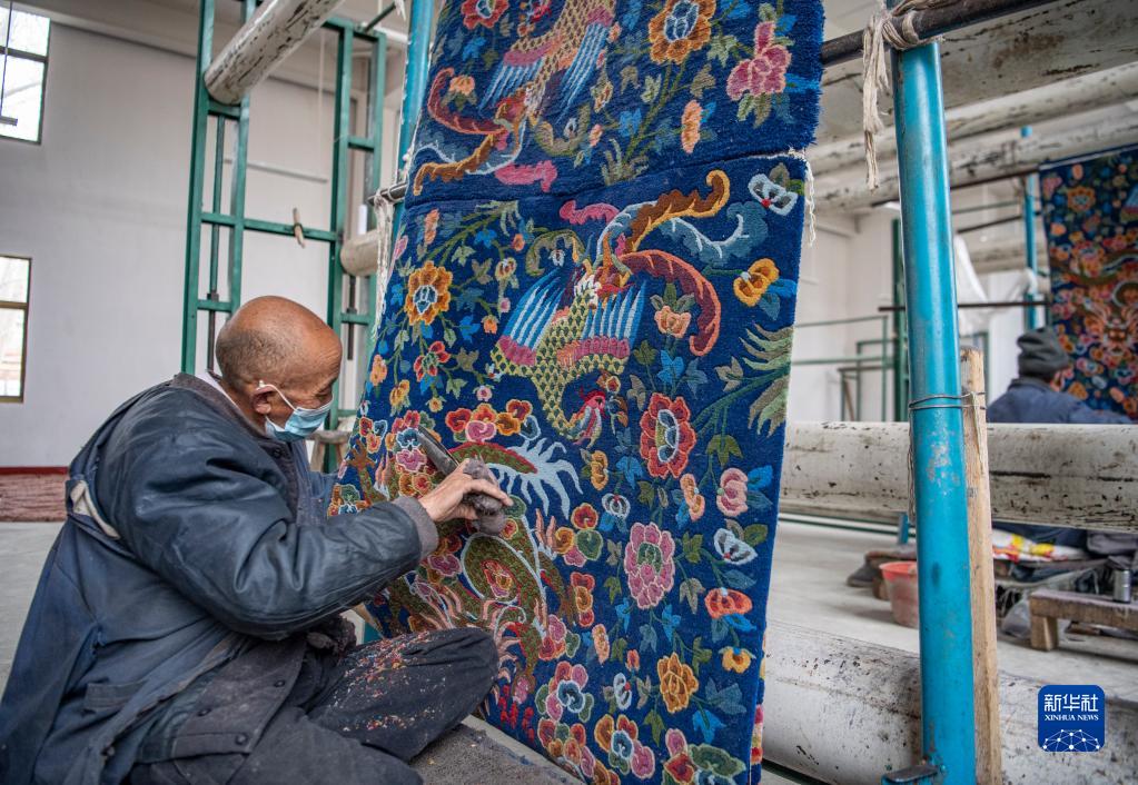 在江孜縣地毯廠,工人對卡墊進行修剪(3月19日攝)。新華社記者 孫非 攝