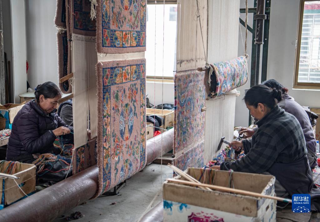 在江孜縣地毯廠,工人們編織卡墊(3月19日攝)。新華社記者 孫非 攝