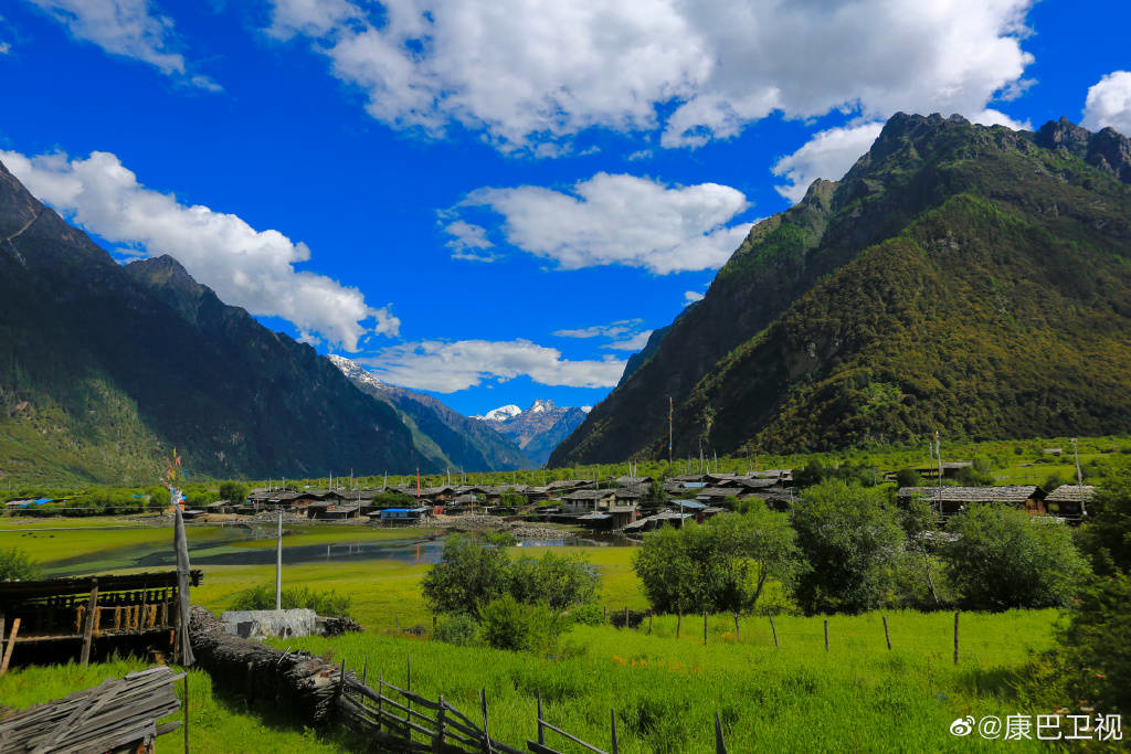 湖邊房舍錯(cuò)落,一湖如帶,濕地從湖邊村緩緩延展至湖畔,而海拔6300多米的杰青那拉嘎布雪山,照映在湖面,飄渺的云霧如從天上飄下……宛如一座世外桃源小仙境。