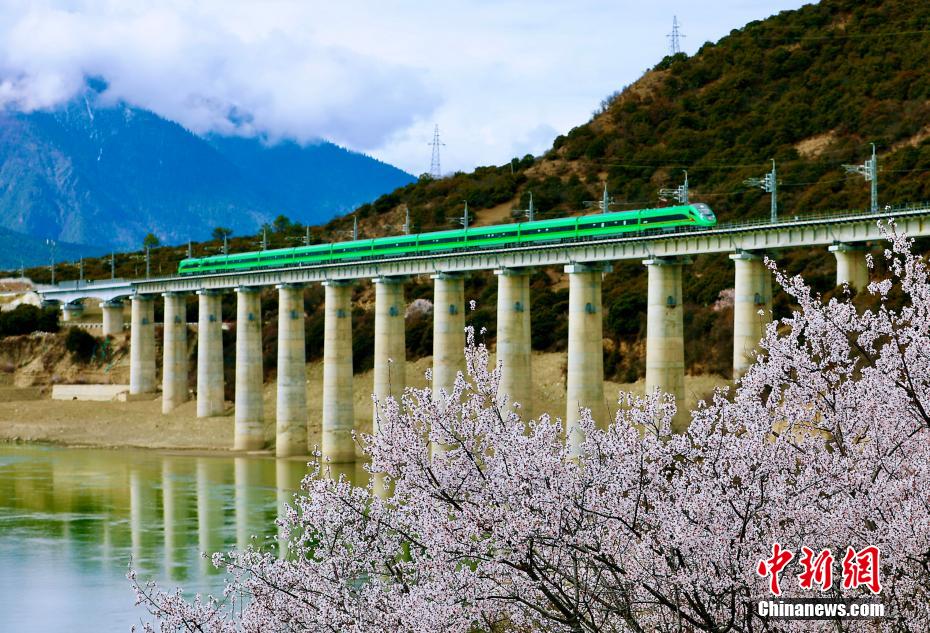 近日,中國(guó)鐵路青藏集團(tuán)有限公司介紹,3月下旬至4月,拉林鐵路沿線綿延的野生桃花林盛開,藍(lán)天、白云、桃花、雪山、高原復(fù)興號(hào)動(dòng)車等相互交織,形成了一幅幅美不勝收的畫面。圖為穿梭在桃花林中的拉林鐵路高原復(fù)興號(hào)。