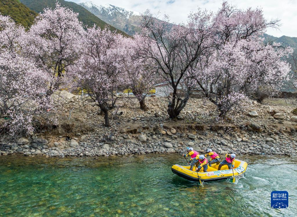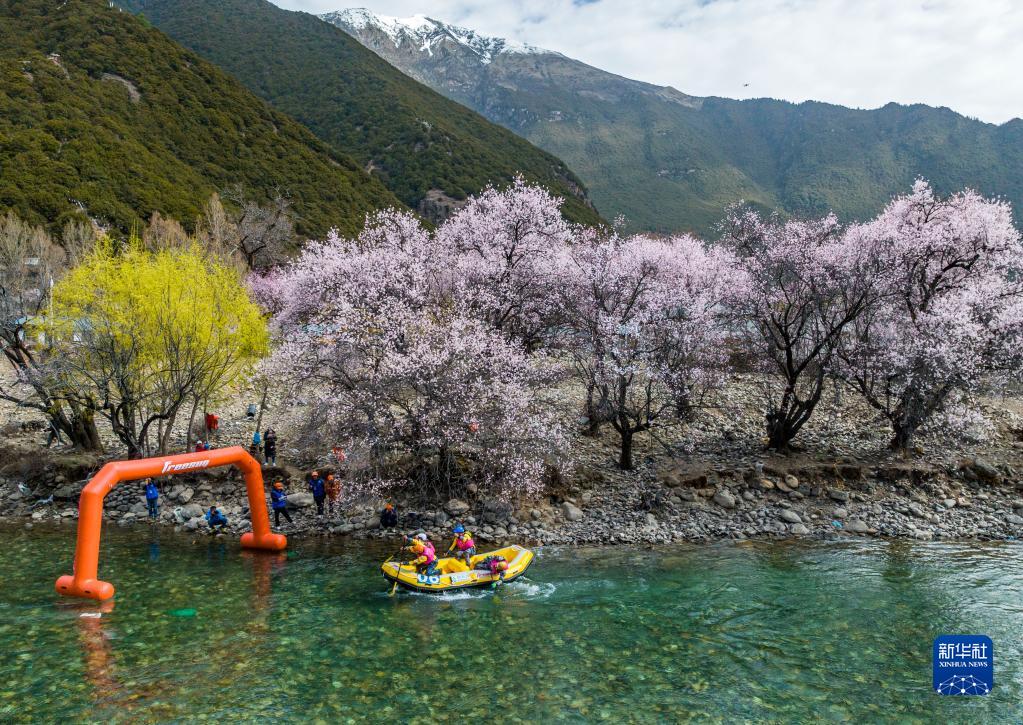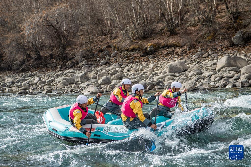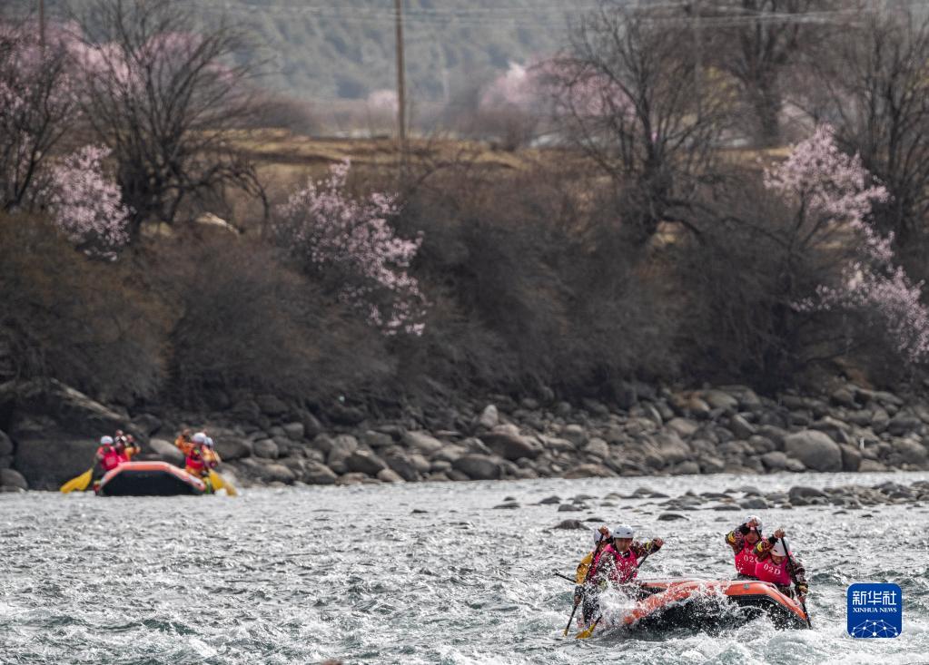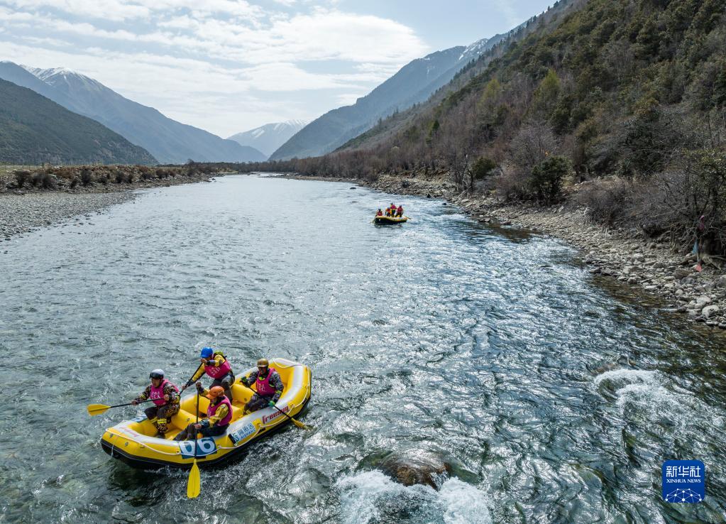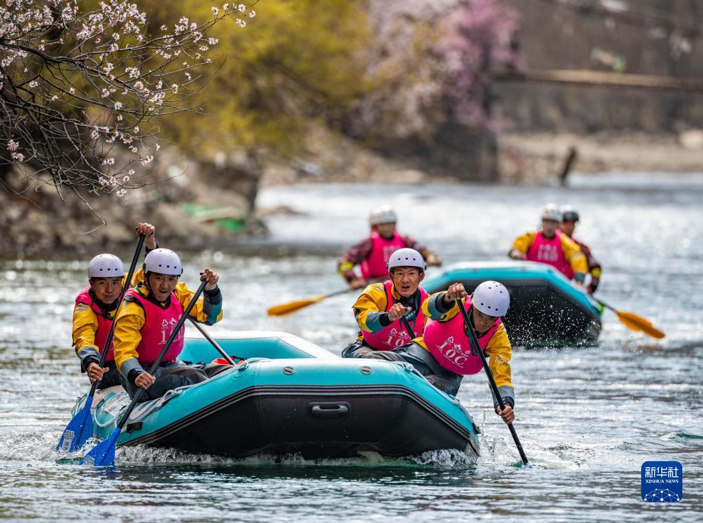 4月16日,西藏旅游股份有限公司漂流隊(前)在激流漂流筏追逐賽中。最終,他們獲得亞軍。新華社記者 孫非 攝