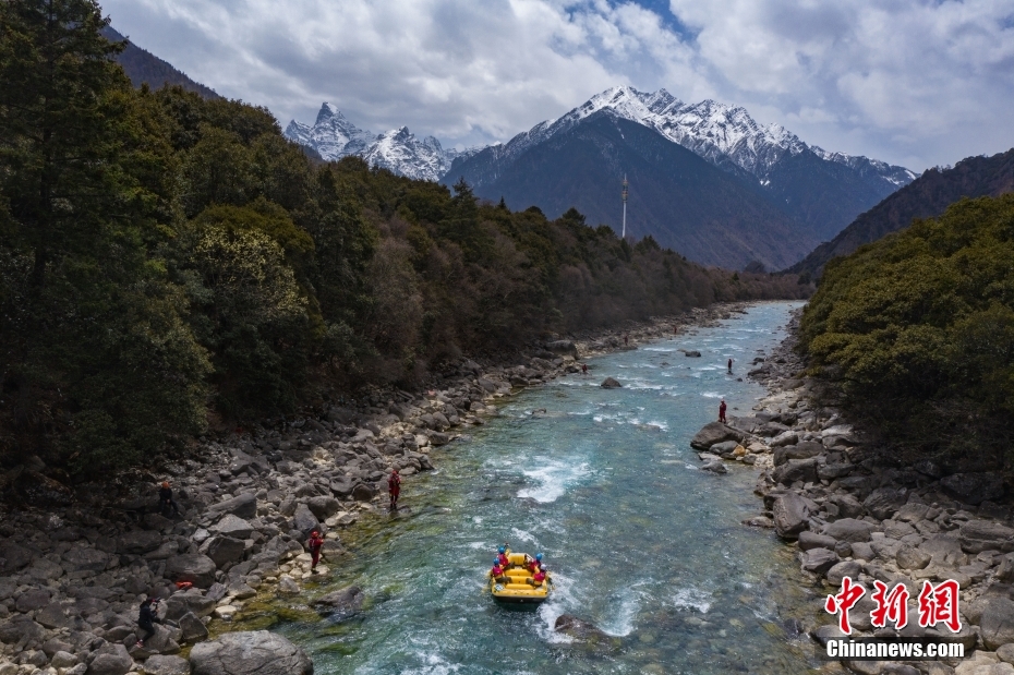 圖為激流漂流筏追逐賽比賽現(xiàn)場。(無人機照片)中新社記者 貢嘎來松 攝