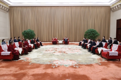 四月二十五日,河南省委書記樓陽(yáng)生、省長(zhǎng)王凱在鄭州會(huì)見班禪額爾德尼·確吉杰布一行。 記者 董亮 攝