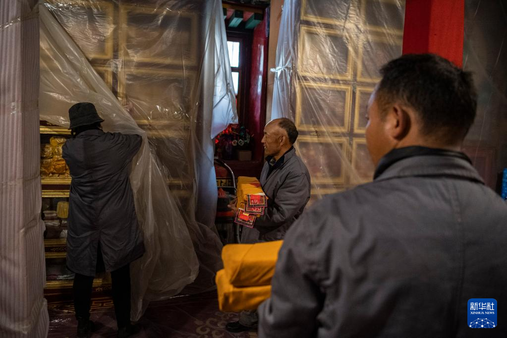 久米次成(左一)在布達拉宮整理館藏貝葉經(jīng)(2008年5月12日攝)。新華社發(fā)