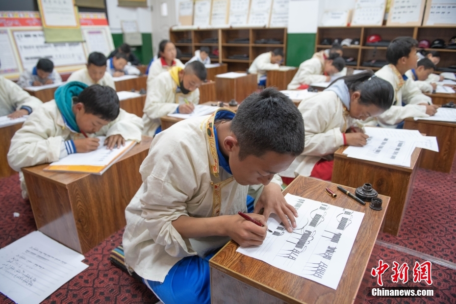 5月7日,西藏山南市,加查縣中學(xué)學(xué)生和教師在上藏文書法興趣班。該興趣班由2名藏文教師任教,每周兩課時,利用自習(xí)課或晚自習(xí)時間為學(xué)生和教師授課。課程內(nèi)容包含執(zhí)筆、運(yùn)筆、姿勢等基礎(chǔ)書寫技能,以及藏文中的烏金體、珠擦體、簇仁體、簇通體等各類字體的書寫方法。