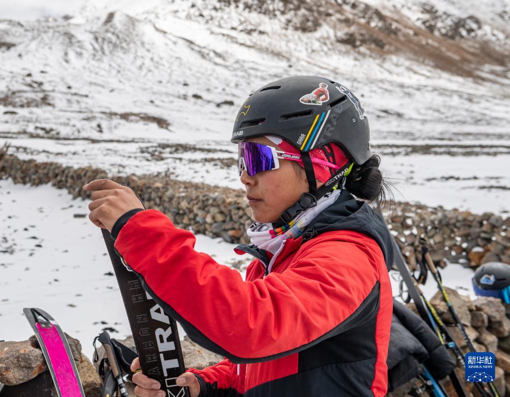 在西藏拉薩市當雄縣羊八井鎮(zhèn),玉珍拉姆在訓練前為雪板粘貼止滑帶(5月2日攝)。新華社記者 孫非 攝