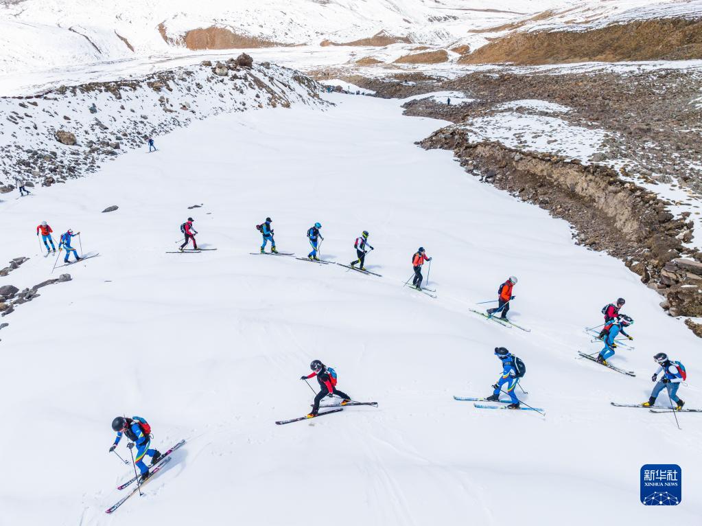 在西藏拉薩市當雄縣羊八井鎮(zhèn),玉珍拉姆(前排左二)和隊友進行滑雪登山訓練(5月2日攝,無人機照片)。新華社記者 孫非 攝