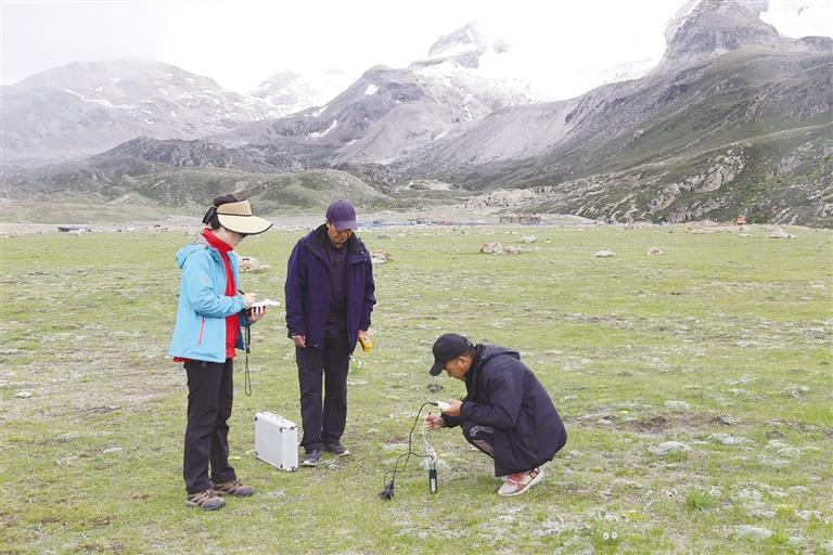科研人員正在進(jìn)行植被覆蓋度及土壤濕度觀測(cè)。圖由受訪者提供
