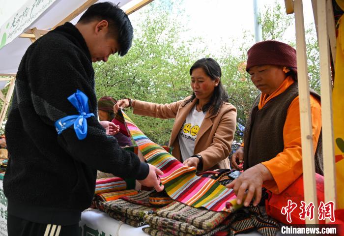 圖為活動市集中,游客了解藏族手工氆氌。趙朗 攝