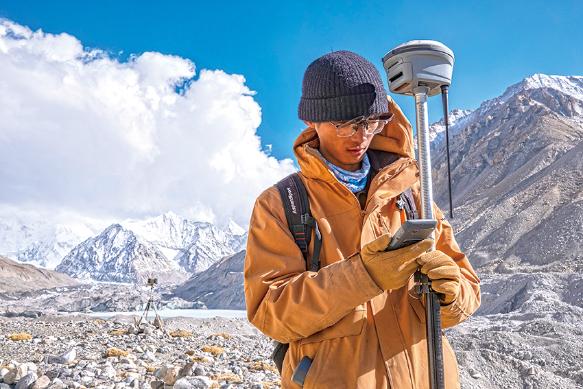 來自中國(guó)科學(xué)院西北生態(tài)環(huán)境資源研究院的科考隊(duì)員薛雨昂在對(duì)冰川進(jìn)行實(shí)時(shí)差分GPS定位(5月15日攝)。新華社記者晉美多吉攝