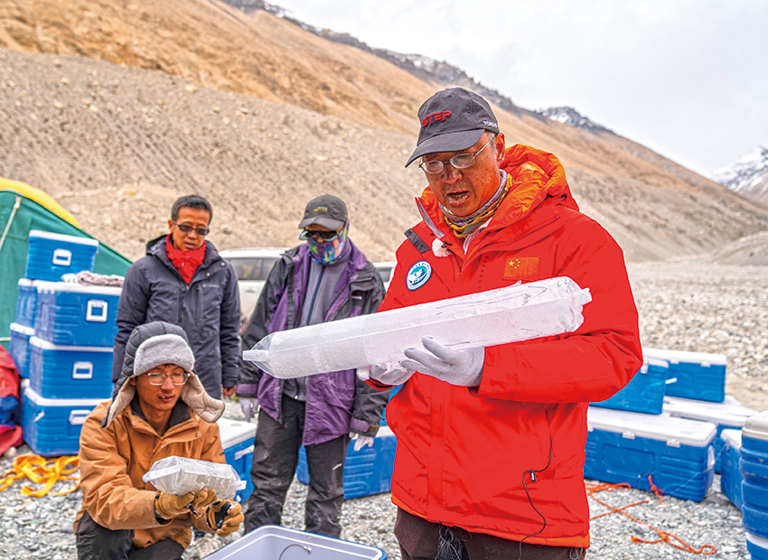 在珠峰登山大本營(yíng),中國(guó)科學(xué)院西北生態(tài)環(huán)境資源研究院副院長(zhǎng)康世昌(右)在查看從珠峰海拔約6500米處鉆取的冰芯樣品(5月22日攝)。新華社記者孫非攝