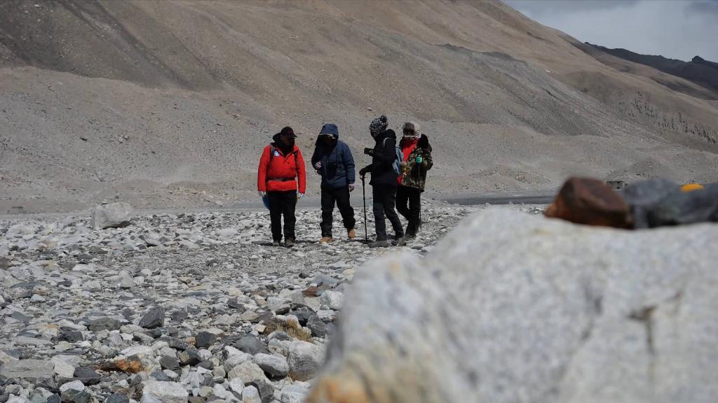 在海拔5200米的登山大本營附近的絨布河進(jìn)行完檢測后,科考人員一行計(jì)劃前往約三公里外的中絨布冰川末端的冰湖,采集冰川融水樣本并檢測水質(zhì)。