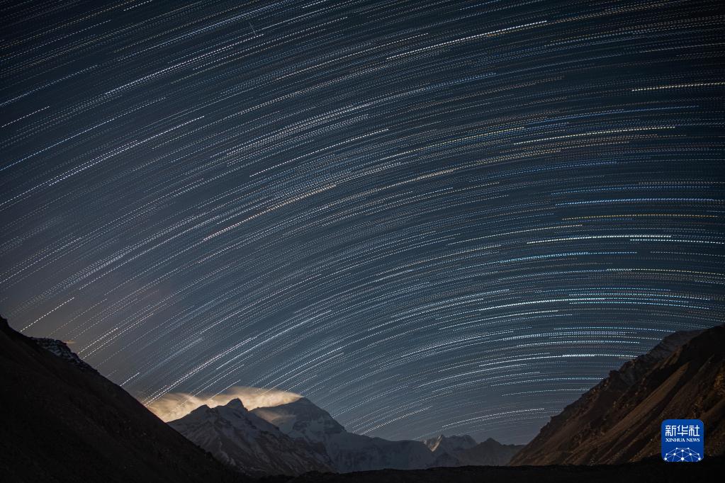 這是5月23日在珠峰大本營拍攝的星軌(合成照片)。新華社記者 孫非 攝