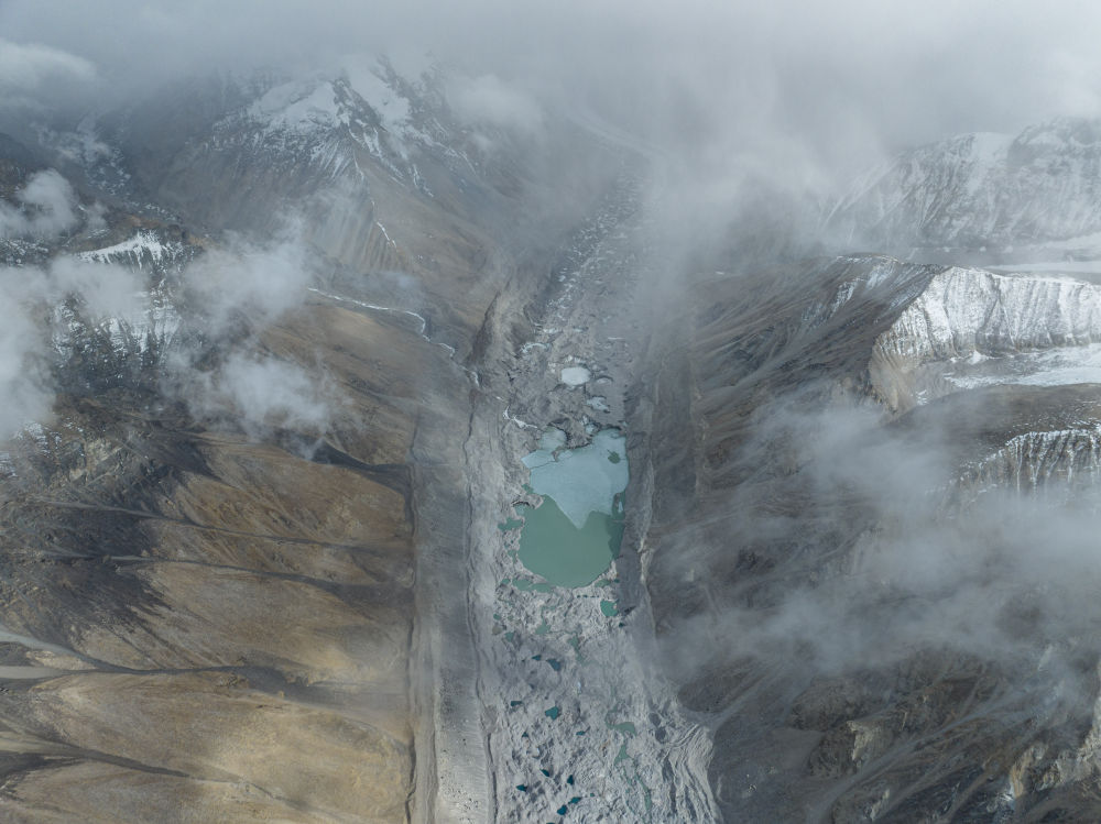 這是在海拔7000米左右高空拍攝的由絨布冰川融水形成的湖泊群(5月25日攝,無(wú)人機(jī)照片)。新華社發(fā)(旦增努布 攝)