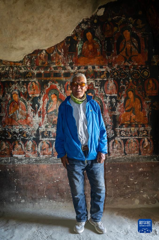 5月26日,仁增旺扎老人在皮央石窟的壁畫前留影。新華社記者 費茂華 攝