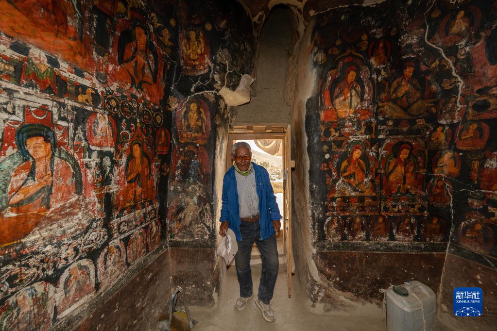 5月26日,仁增旺扎老人走進繪滿壁畫的石窟。新華社記者 費茂華 攝