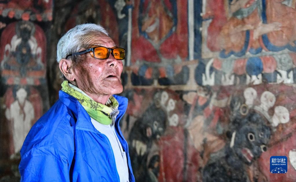 仁增旺扎老人查看壁畫(5月26日攝)。新華社記者 晉美多吉 攝