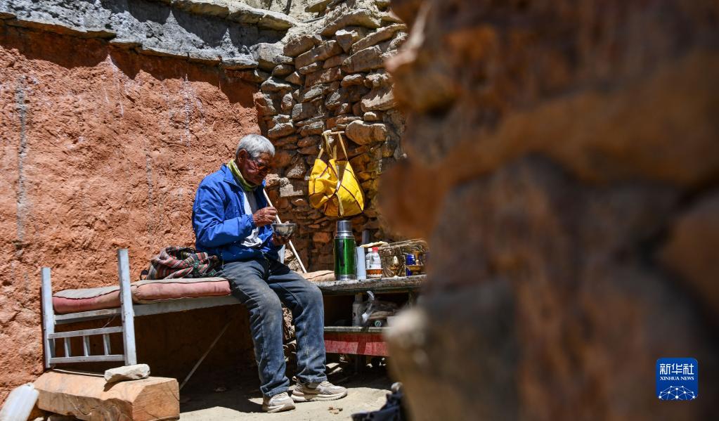 仁增旺扎老人在石窟旁吃午飯(5月26日攝)。新華社記者 晉美多吉 攝