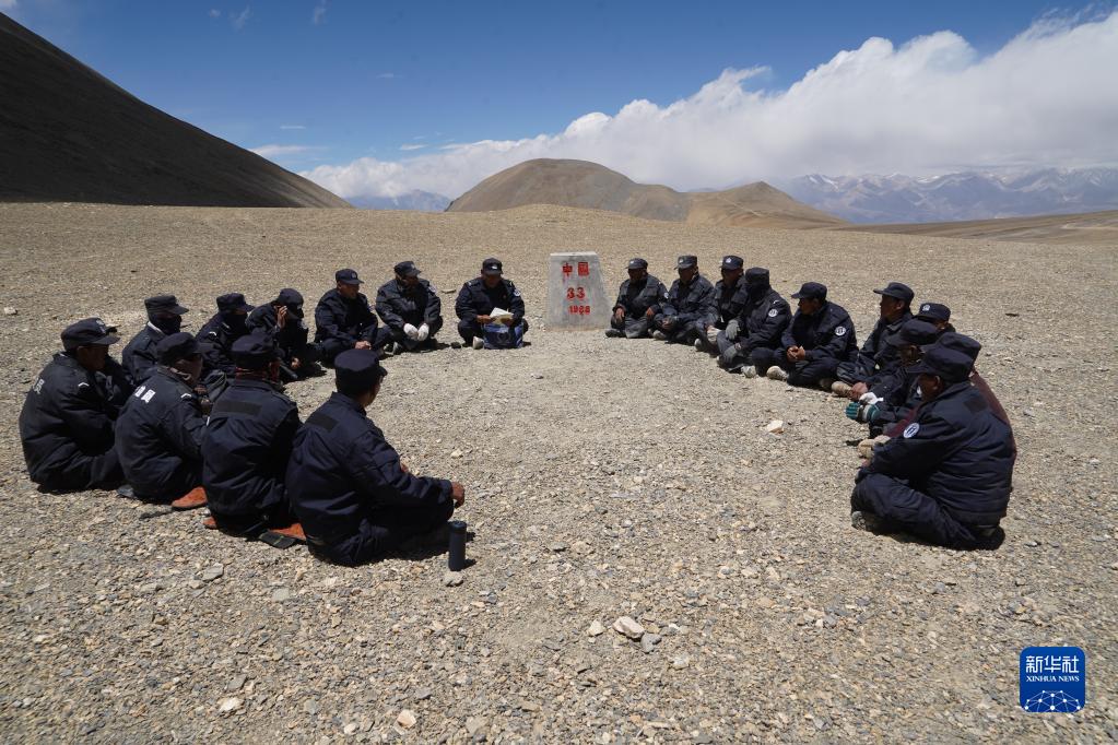 6月2日,在33號(hào)界樁處,護(hù)邊聯(lián)防隊(duì)在隊(duì)長(zhǎng)石角(右二)的帶領(lǐng)下學(xué)習(xí)。新華社記者 晉美多吉 攝