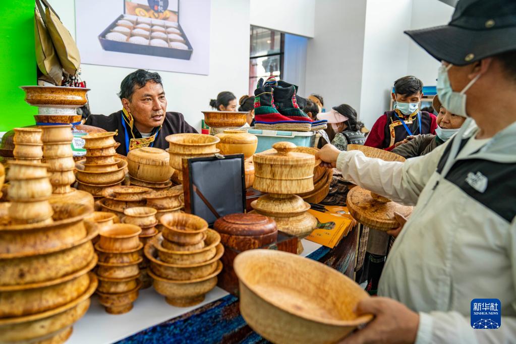 6月17日,工作人員在第五屆藏博會(huì)現(xiàn)場為顧客介紹木碗產(chǎn)品。新華社記者 孫非 攝