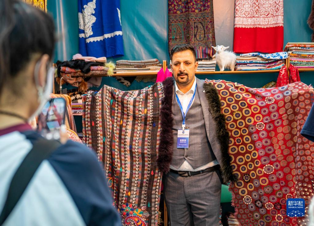 6月17日,來自印度的參展商在第五屆藏博會(huì)現(xiàn)場向顧客展示披肩。新華社記者 孫非 攝