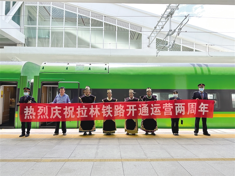2021年6月25日,拉林鐵路開通運(yùn)營(yíng),結(jié)束了藏東南不通鐵路的歷史,復(fù)興號(hào)動(dòng)車開到西藏,駛上拉林鐵路,拉薩至山南、林芝最快1小時(shí)4分、3小時(shí)30分可達(dá);山南至林芝最快2小時(shí)22分可達(dá),相比汽車,從拉薩到林芝的時(shí)間幾乎節(jié)省了一半,從山南到林芝,也節(jié)省了2個(gè)多小時(shí)。兩年來(lái),隨著運(yùn)行方式逐漸成熟,鐵路方便、快捷的運(yùn)輸優(yōu)勢(shì)逐步顯現(xiàn),客流持續(xù)攀升,青藏集團(tuán)有限公司及時(shí)根據(jù)客流情況在周末、節(jié)假日、寒暑假等客流高峰期增開281趟臨時(shí)旅客列車。兩年來(lái),拉林鐵路共運(yùn)送旅客182.5萬(wàn)人次,運(yùn)輸貨物41.91萬(wàn)噸,拉近了藏東南地區(qū)9個(gè)城市的距離,也深刻改變了當(dāng)?shù)厝嗣竦墓ぷ骱蜕钣^念。