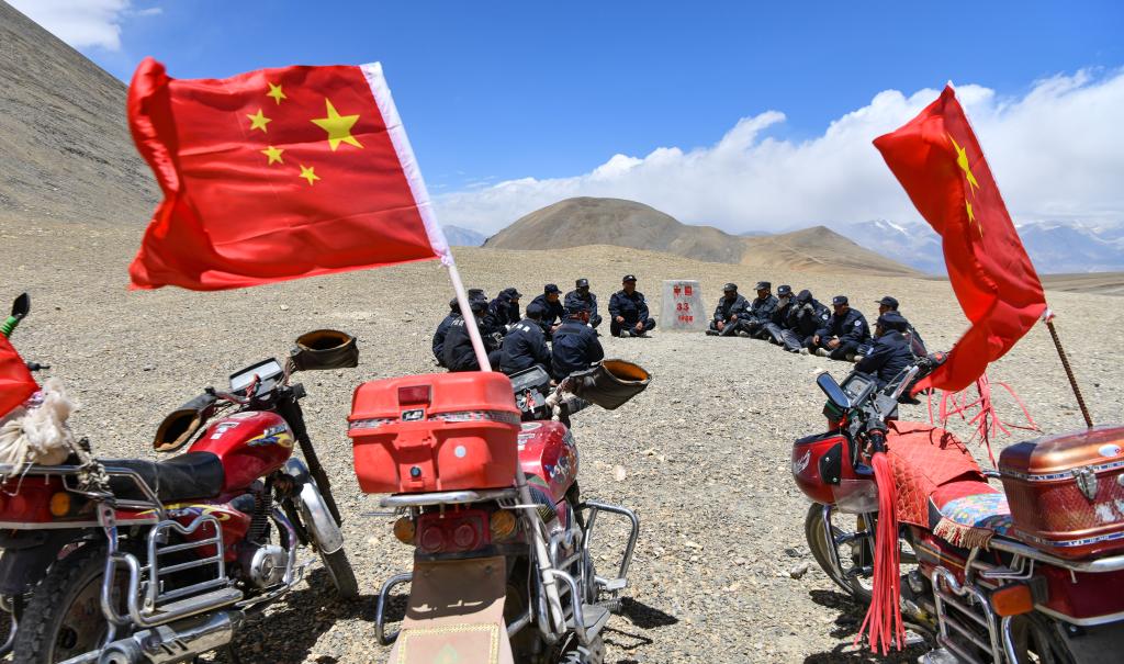 在33號(hào)界碑處,護(hù)邊隊(duì)在隊(duì)長(zhǎng)的帶領(lǐng)下開(kāi)展學(xué)習(xí)(6月2日攝)。新華社記者 晉美多吉 攝