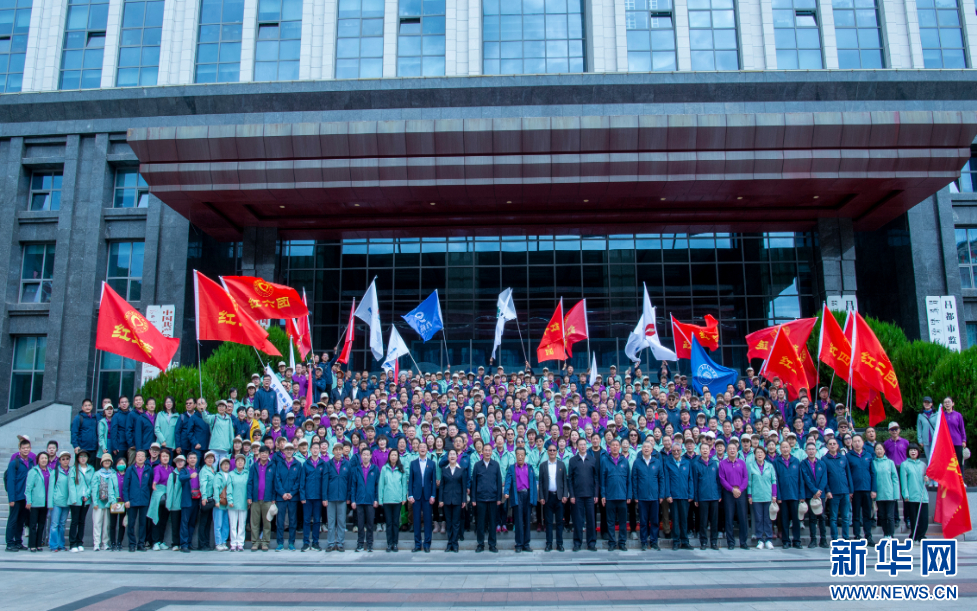 7月8日,來(lái)自北京200余家醫(yī)療單位的453位醫(yī)護(hù)人員和100余位愛心志愿者合影。新華網(wǎng) 旦增努布 攝