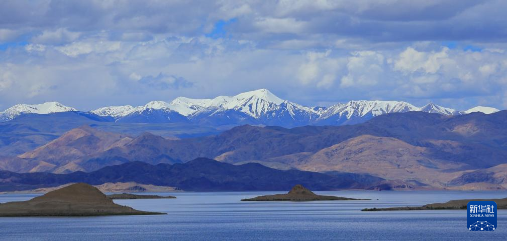 班公湖遠(yuǎn)處的雪山(7月28日攝)。新華社發(fā) (尚路航攝)