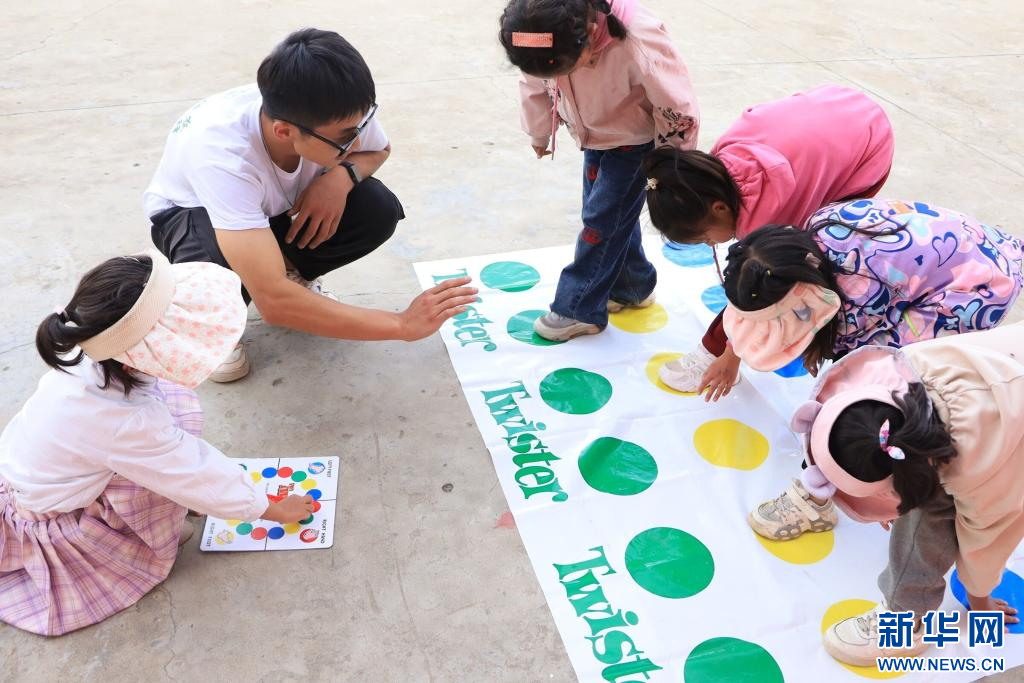 中國農(nóng)業(yè)大學(xué)峰云社人文科考隊(duì)隊(duì)員帶領(lǐng)孩子們進(jìn)行課外活動(dòng)。新華社發(fā)
