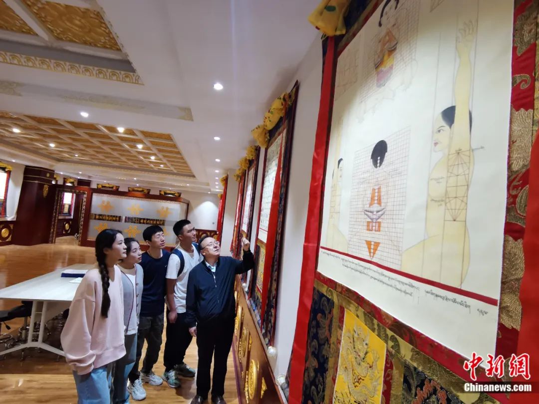 李先加向?qū)W生們介紹藏醫(yī)藥曼唐。受訪者供圖
