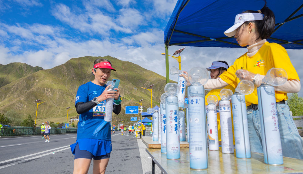 馬拉松愛(ài)好者正在領(lǐng)取氧氣罐。新華社發(fā)(丁增尼達(dá) 攝)