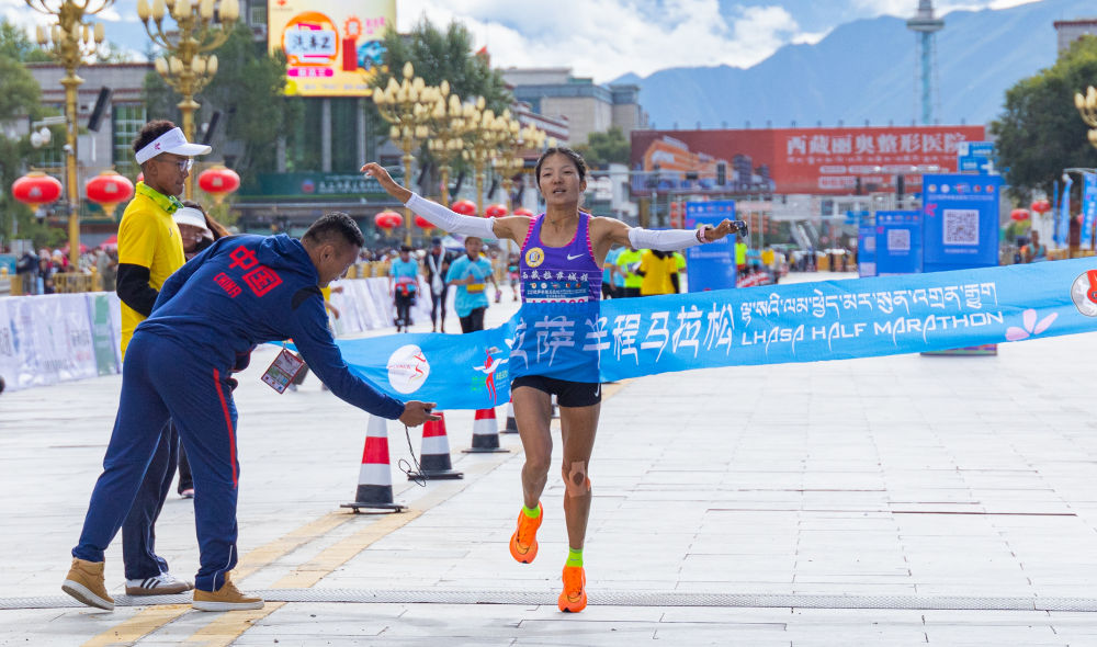 2023拉薩半程馬拉松女子組選手次仁措姆沖線(xiàn)奪冠瞬間。新華社發(fā)(丁增尼達(dá) 攝)