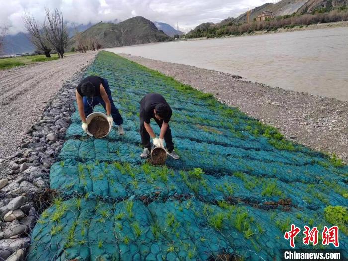 圖為工人們對生態(tài)袋進行養(yǎng)護。中國水電基礎局西藏分公司供圖