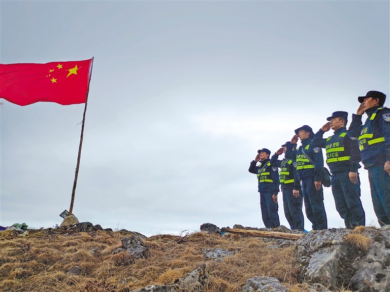 立新邊境派出所民警前往仁滇牧場(chǎng)巡邏踏查時(shí)向國(guó)旗宣誓。圖片由日喀則邊境管理支隊(duì)提供