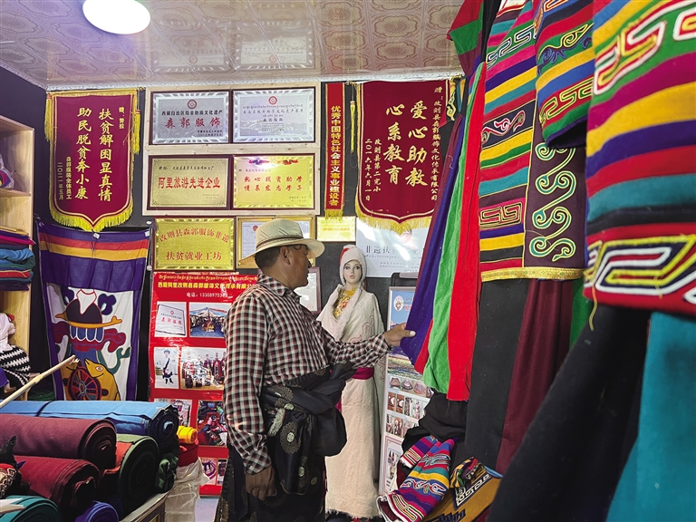 努拉今年66歲,自他曾祖父起,家人就開始從事“森郭服飾”制作,并將這項非遺技藝一代一代傳承了下來。努拉告訴記者:“從父親那一輩開始,由于外來服飾的流入,藏民族傳統(tǒng)服飾的發(fā)展就不如從前了,這對‘森郭服飾’的傳承也有很大的影響?!?/p>