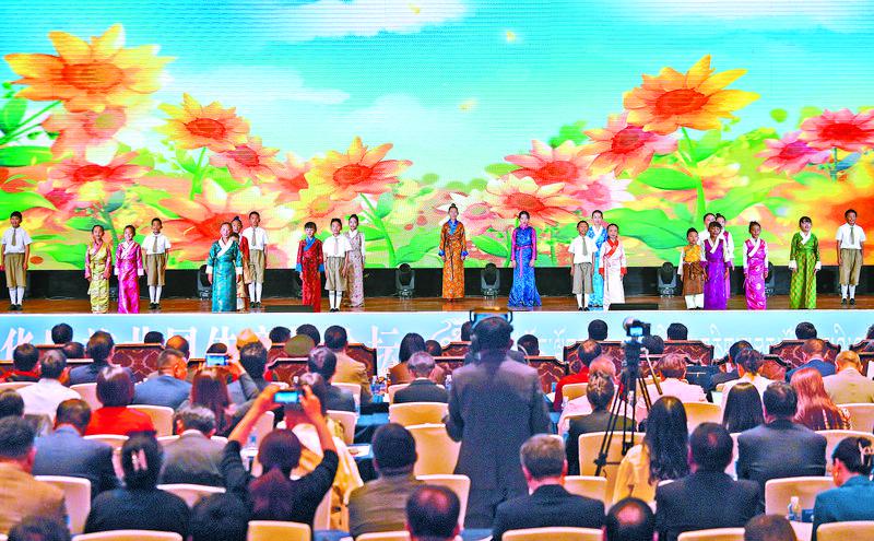 9月19日,由自治區(qū)黨委、自治區(qū)政府主辦的首屆西藏鑄牢中華民族共同體意識論壇在拉薩開幕。圖為在開幕式上,西藏珠峰少年合唱團演唱《珞巴少年》。記者 潘多 攝