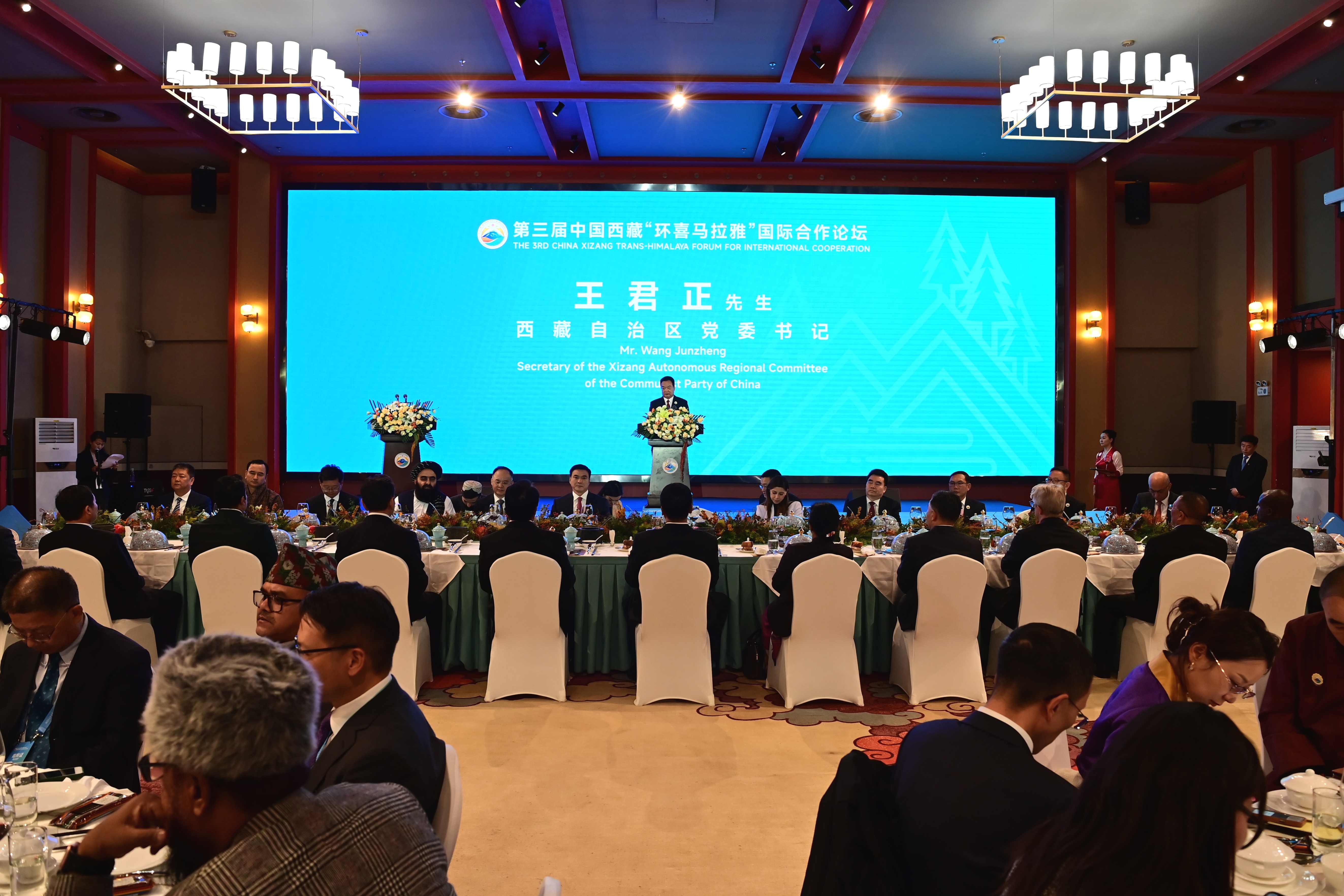 10月4日晚,第三屆中國(guó)西藏“環(huán)喜馬拉雅”國(guó)際合作論壇在林芝魯朗舉行歡迎招待會(huì)。這是自治區(qū)黨委書記王君正出席并致辭。記者 旦增西旦 攝