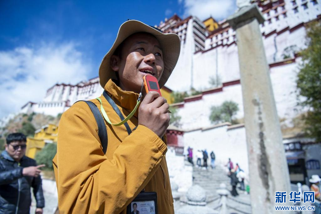 10月18日,一名導(dǎo)游在向游客講解布達拉宮歷史。新華網(wǎng) 旦增努布 攝